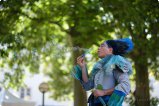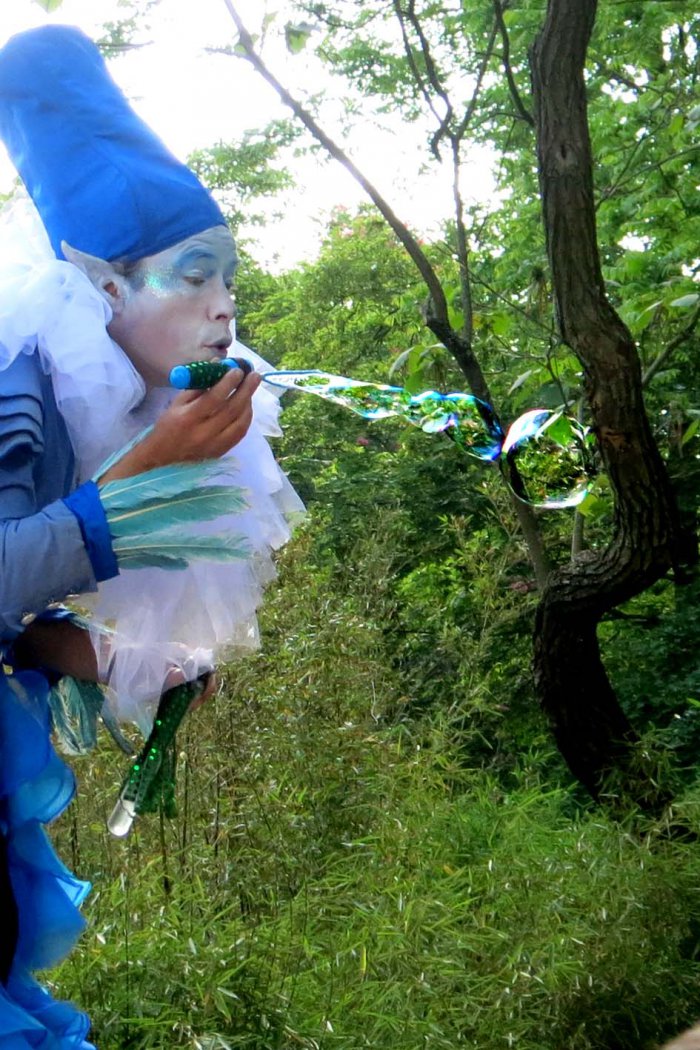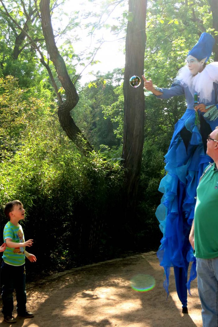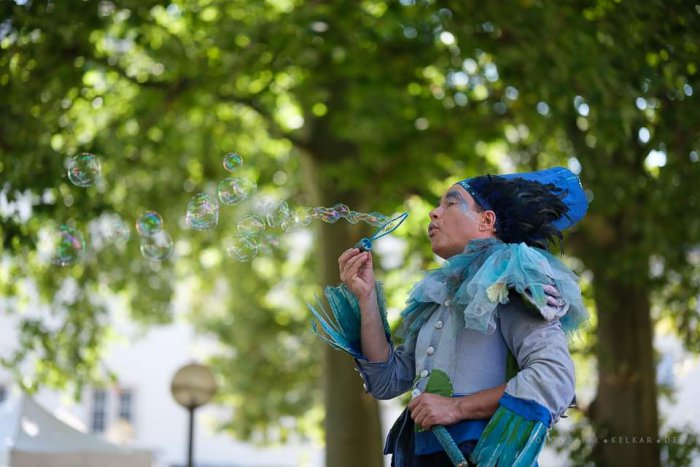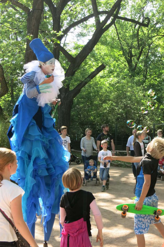 Aus einem Meer von Seifenblasen taucht der blaue Traumelf weit über den Köpfen der Menschen auf. Seine bunten Traumblasen umgarnen Groß und Klein, fordern zum Spiel und bescheren den Menschen süße Träume.